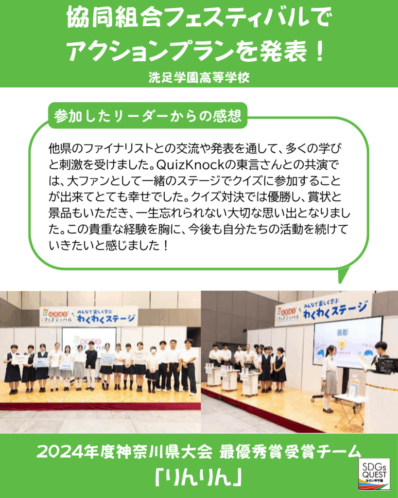 2024年度神奈川県大会 最優秀賞受賞チーム「りんりん」(洗足学園高等学校)が、みらい甲子園で作成したアクションプランを発表しました。