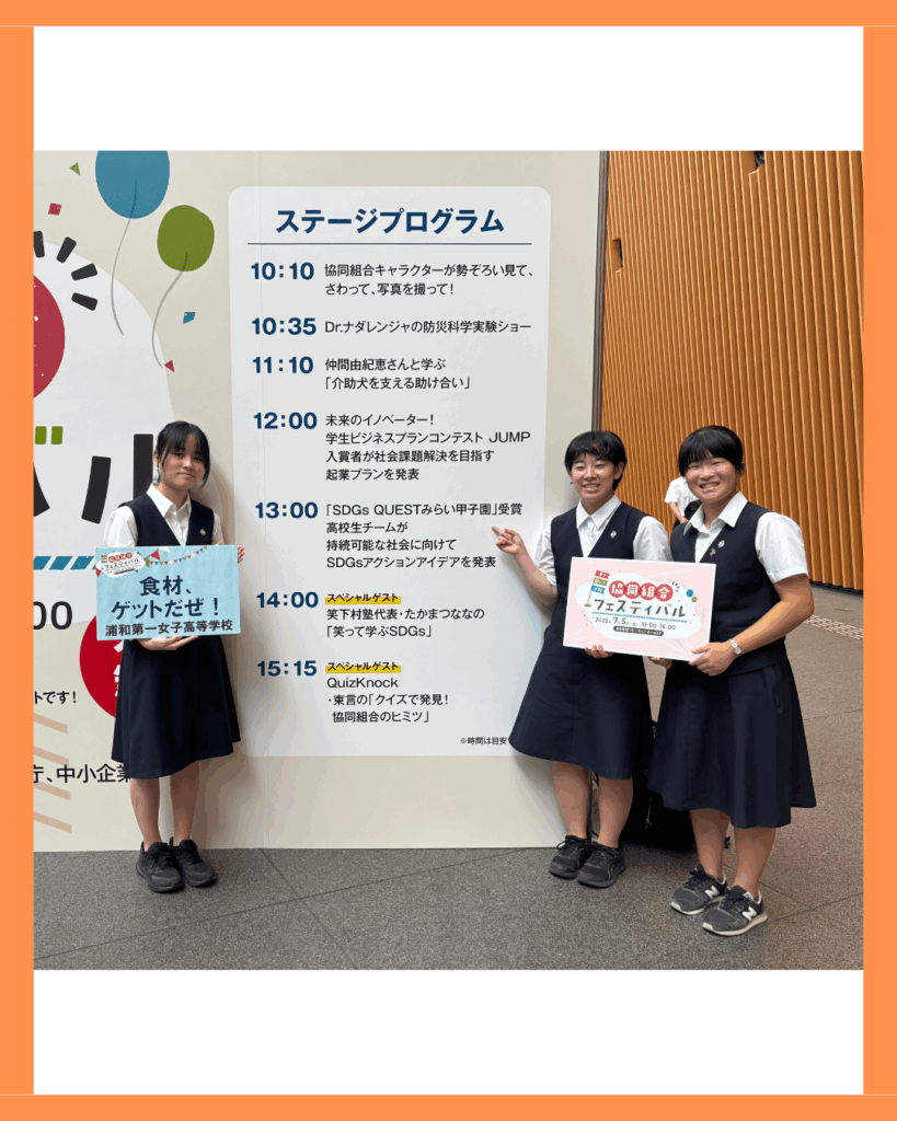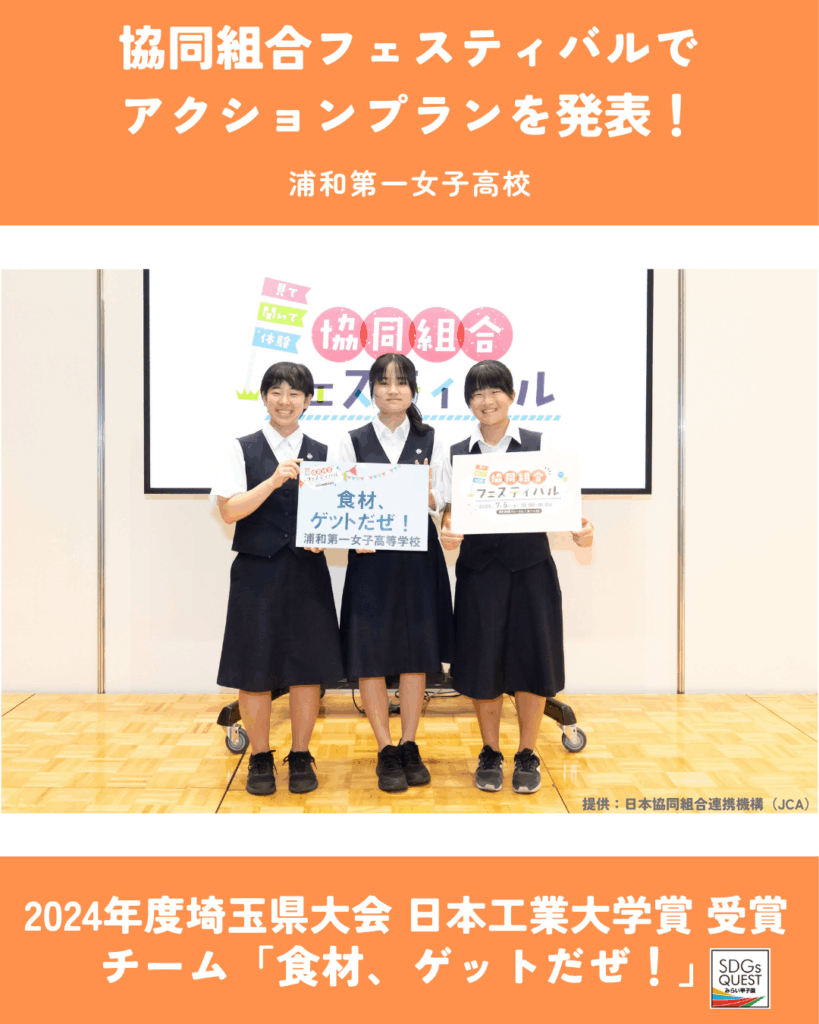 2024年度埼玉県大会 日本工業大学賞受賞チーム「食材、ゲットだぜ!」(埼玉県立浦和第一女子高等学校)のみなさんが東京国際フォーラムで開催された「協同組合フェスティバル」に参加し、みらい甲子園で作成したアクションプランを発表しました。