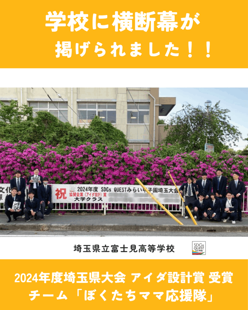 2024年度埼玉県大会にて、企業賞であるアイダ設計賞を受賞した「ぼくたちママ応援隊」のみなさんの功績が称えられ、学校に横断幕が掲げられました☆